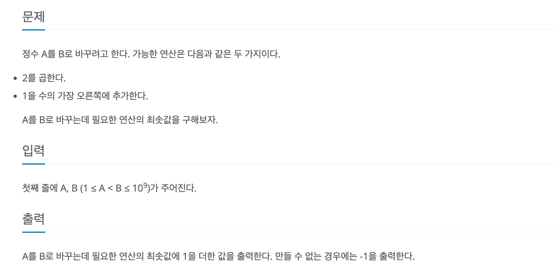 🗂️ 문제 16953. A → B 📌 PointBFSA에서 2를 곱한 값과 1을 가장 오른쪽에 추가한 값으로 가지치기 하면서 B에 도달할 때까지 탐색한다. 📄 코드from collections import deque, defaultdicta, b = map(int, input().split())visited = defaultdict(int)q = deque([(a, 1)])visited[a] = 0ans = -1while q: num, cnt = q.popleft() #현재 숫자, 탐색 횟수 if num == b: #목표 숫자에 도달하면 탈출 ans = cnt break mul_two, add_one = num * 2, int(str(nu..