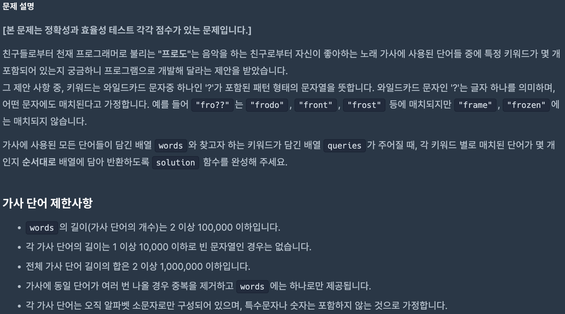 🗂️ 문제 2020 KAKAO BLIND RECRUITMENT_가사 검색 📌 Point트라이(Trie) 자료구조 단어의 길이별로 Trie 자료구조를 만들어서 효율적으로 쿼리를 처리할 수 있도록 한다. 정방향 Trie와 역방향 Trie를 동시에 초기화하고 단어를 삽입한다. 정방향 Trie : 접미사에 "?"가 있을 때 사용 역방향 Trie : 접두사에 "?"가 있을 때 사용 📁 데이터 구조 예시 📎 입력 단어words = ["apple", "app", "bat"] 📎 길이별 Trie 초기화# 정방향 Trie (tries)tries = { 3: Trie(), # 3글자 단어용 Trie 5: Trie() # 5글자 단어용 Trie}# 역방향 ..